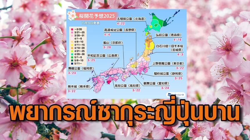 วันนี้ 9 มกราคม เว็บไซด์ Weather News ออกประกาศ "พยากรณ์การบานสะพรั่งของดอกซากุระครั้งแรก" ประจำปี 2025 คาดว่า “ซากุระโซเมโยชิโนะ” ในโตเกียว บานวันที่ 21 มีนาคม ตามมาด้วยโยโกฮาม่าและโคจิ วันที่ 22 มีนาคม หลังจากนั้นทางตะวันตกและตะวันออกของญี่ปุ่นมีแนวโน้มออกดอกตามปกติ ส่วนนาโกย่าซากุระบานช่วงวันที่ 24 มีนาคม และที่โอซาก้า วันที่ 26 มีนาคม ที่อาราชิยามะ (เกียวโต) 28 มีนาคม, ฮิโรซากิ (อาโอโมริ) วันที่ 18 เมษายน และที่ ฮอกไกโด จะเริ่มบานที่ฮาโกดาเตะ วันที่ 22 เมษายน ก่อนบานทั่วทั้งจังหวัดจนถึงต้นเดือนพฤษภาคม ซึ่งซากุระในพื้นที่ต่างๆ จะบานเต็มที่ภายใน 5 วันถึง 2 สัปดาห์หลังจากเริ่มบาน