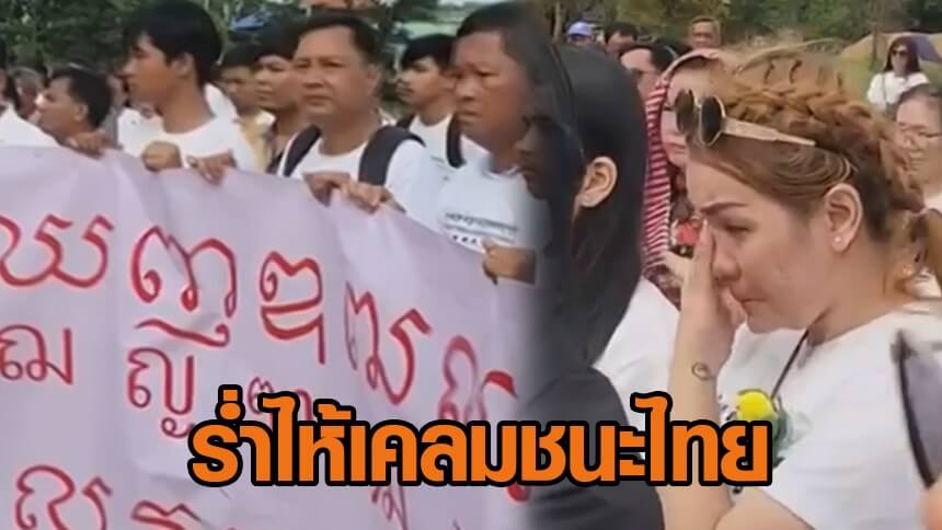 ชาวกัมพูชารวมตัวร้องเพลงชาติ กลั้นน้ำตาไม่อยู่ ใกล้ปราสาทตาเมือนธม แกนนำประกาศ นี่คือชัยชนะอันยิ่งใหญ่ของกัมพูชาที่มีต่อประเทศไทย เมื่อคนเขมรหลายหมื่นคน (ความจริงเพียง 900 คนเท่านั้น) ถือป้ายเคลมพยัญชนะไทย 44 ตัว ได้สร้างความเจ็บปวดให้กับคนไทยอย่างที่สุด ลั่น! 3 ปราสาทเป็นของกัมพูชา พวกไทยอย่าหวัง เราจะตอบโต้ด้วยสุดกำลัง