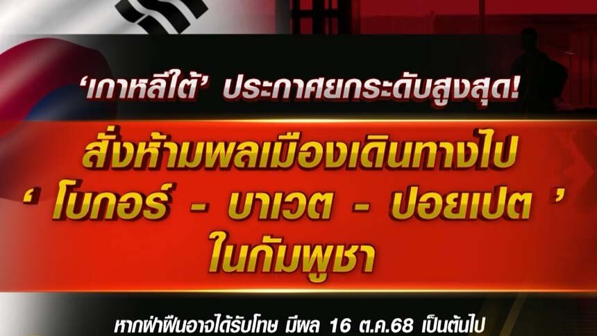 ขณะเดียวกันวานนี้ (15 ต.ค.68) เกาหลีใต้ ออกประกาศห้ามพลเรือนเดินทางเข้าไปในหลายพื้นที่ของกัมพูชา แล้วในวันนี้ ท่ามกลางความวิตกกังวลที่เพิ่มขึ้น เกี่ยวกับพลเรือนชาวเกาหลีใต้ที่ถูกหลอกเข้าไปทำงานในศูนย์สแกมเมอร์ ในกัมพูชา