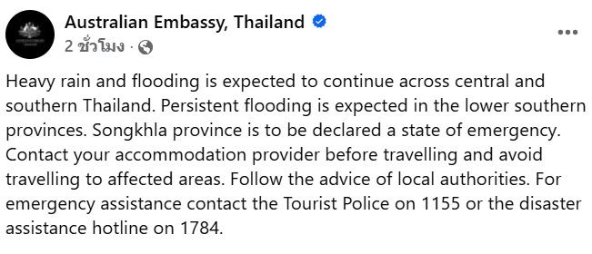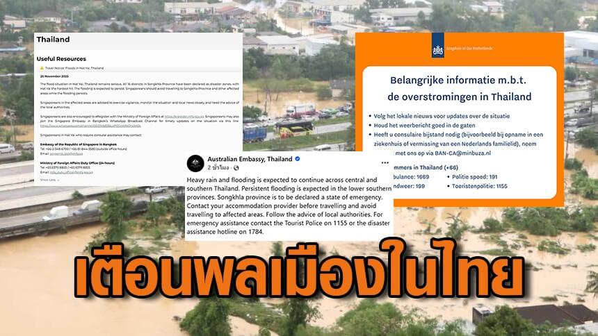 “สิงคโปร์” ประกาศเตือนภัยระดับสูงแก่พลเมืองในหาดใหญ่ จ.สงขลา แนะลงทะเบียนออนไลน์กับกระทรวงฯ ขณะที่ “สถานทูตออสเตรเลีย” ประจำประเทศไทย เตือนประชาชนให้หลีกเลี่ยงการเดินทางไปยังพื้นที่น้ำท่วมในภาคใต้ของไทย ด้าน “ทูตเนเธอร์แลนด์” เตือนพลเมืองดัตช์ในไทยระวัง “น้ำท่วม-ดินถล่ม” พร้อมเปิดสายด่วนข้ามทวีป 24 ชม.