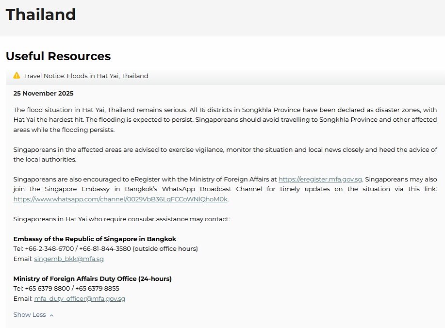 แถลงการณ์ของกระทรวงการต่างประเทศสิงคโปร์ยังระบุว่า ทางการไทยได้ประกาศให้หาดใหญ่เป็น “เขตภัยพิบัติ” โดยเสริมว่าน้ำท่วมส่งผลให้กระแสไฟฟ้าถูกตัดขาด และการเข้าถึงอาหารรวมถึงสิ่งของจำเป็นเป็นไปอย่างยากลำบาก