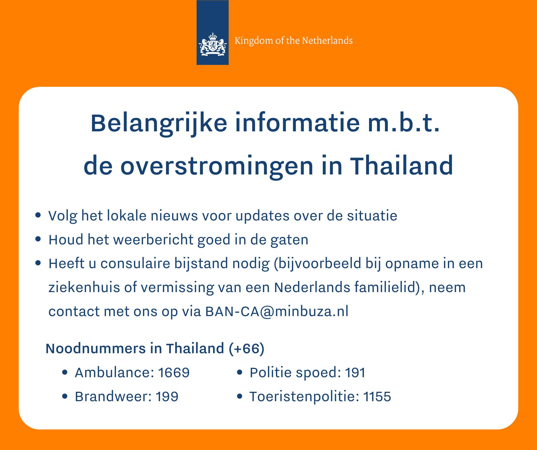 หากเกิดเหตุวิกฤตเร่งด่วน สามารถโทรเข้าศูนย์ฉุกเฉินกระทรวงการต่างประเทศที่เนเธอร์แลนด์ได้ตลอด 24 ชั่วโมง (+31 247 247 247) พร้อมทิ้งท้ายข้อความให้กำลังใจขอให้ทุกคนปลอดภัยผ่านพ้นภัยธรรมชาตินี้ไปได้