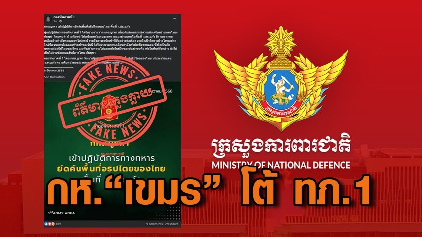 กระทรวงกลาโหมกัมพูชา ระบุว่า เมื่อวันที่ 8 ธันวาคม 2568 ทางกระทรวงฯ ได้ตรวจสอบพบว่าเพจทางการของกองทัพภาคที่ 1 ของไทย ได้ทำการเผยแพร่ข้อมูลอันเป็นเท็จซึ่งขัดแย้งกับความเป็นจริงอย่างชัดเจน โดยมีการลงข้อความกล่าวอ้างว่า “กัมพูชาได้เคลื่อนย้ายอาวุธหนักและยุทโธปกรณ์ทำลายล้างเข้ามายังแนวชายแดนกัมพูชา-ไทย”