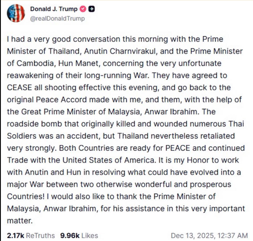 หลังจากนายโดนัลด์ ทรัมป์ ประธานาธิบดีสหรัฐฯ ได้ยกหูหารือกับนายอนุทิน ชาญวีรกูล นายกรัฐมนตรีและรัฐมนตรีว่าการกระทรวงมหาดไทยเมื่อคืนที่ผ่านมา (12 ธ.ค.68) ล่าสุด ทรัมป์ ได้โพสต์ผ่าน Truth Social ระบุว่า ในช่วงเช้าวันนี้ข้าพเจ้าได้พูดคุยกับนายกรัฐมนตรีของประเทศไทย นายอนุทิน ชาญวีรกูล และนายกรัฐมนตรีของกัมพูชา นายฮุน มาเนตอย่างราบรื่นและเป็นประโยชน์อย่างยิ่งเกี่ยวกับเหตุการณ์ความขัดแย้งยืดเยื้อ