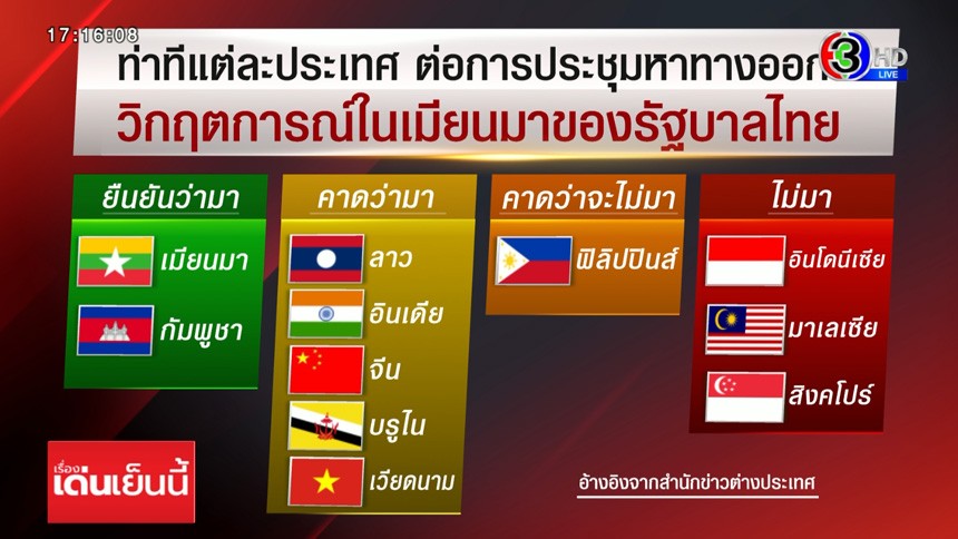 สำนักข่าวต่างประเทศรายงานเกี่ยวกับการประชุมเพื่อหาทางออกให้กับวิกฤตการณ์ในเมียนมาของรัฐบาลไทย โดยระบุว่ามีรัฐมนตรีคนสำคัญจากหลายประเทศปฏิเสธที่จะเดินทางมาเข้าร่วม พร้อมกับมีเสียงวิพากษ์วิจาณ์ออกมาจากหลายฝ่าย