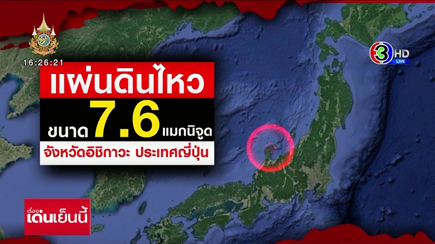 เกิดแผ่นดินไหวขนาด 7.6 แมกนิจูด ที่จังหวัดอิชิกาวะ (Ishikawa) ทางตอนกลางของญี่ปุ่น ในวันนี้ มีประกาศเตือนภัยสึนามิ และแนะนำให้ประชาชนในพื้นที่เสี่ยงเร่งอพยพ