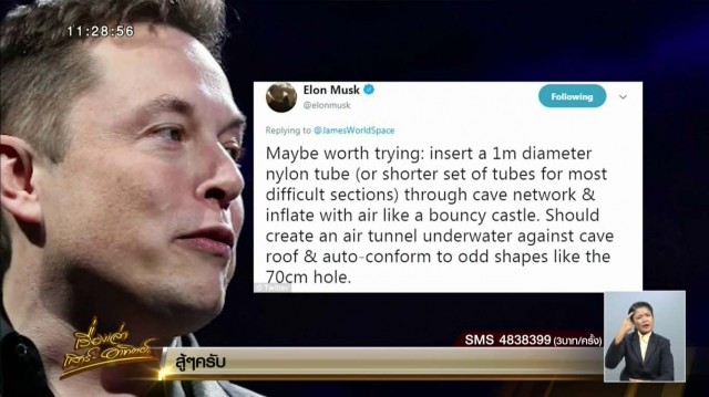 อีลอน มัสก์ ประธานเจ้าหน้าที่บริหาร (ซีอีโอ) บริษัท เทสลา สเปซเอ็กซ์ และบอริง ได้ทวีตข้อความกรณีการให้ความช่วยเหลือ 13 ชีวิตทีมหมูป่าอะคาเดมี่ที่ติดอยู่ในถ้ำหลวง-ขุนน้ำนางนอน อ.แม่สาย จ.เชียงราย เสนอให้ลองใช้ท่อใต้นำ โดยนำท่อไนลอนขนาดกว้าง 1 เมตร ผ่านส่วนต่างๆ ของถ้ำและใช้อากาศพองลม ควรสร้างเป็นอุโมงค์อากาศใต้น้ำและปรับรูปร่างให้เขากับลักษณะของถ้ำ โดยยังระบุอีกว่า ได้ส่งทีมวิศวกรของสเปซเอ็กซ์และบอริง เดินทางมาประเทศไทยเพื่อร่วมภารกิจนี้ โดยทีมงานจะเดินทางมาถึงในคืนวันนี้ (7 ก.ค.)