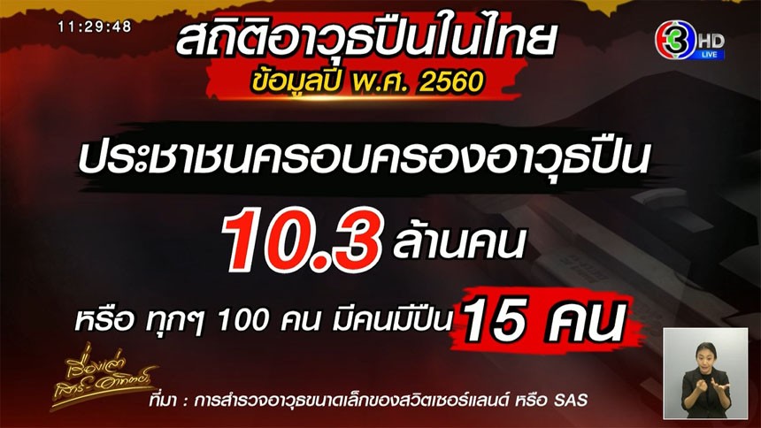 สถิติชี้ชัด ไทยครองปืนสูงสุดในอาเซียน มากกว่า 10.3 ล้านคน ประชากร 100 คน มีปืนแล้ว 15 คน ส่นวเหตุฆาตกรรมจากอาวุธ ปืนเป็นรองแค่ ฟิลิปปินส์