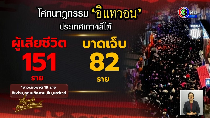 กลายเป็นข่าวดังไปทั่วโลก ตั้งแต่ค่ำคืนที่ผ่านมา หลังเกิดเหตุคนเบียดเสียดและล้มทับกัน จนขาดอากาศหายใจ ที่อิแทวอน ย่านท่องเที่ยวชื่อดัง ของกรุงโซล ประเทศเกาหลีใต้ ล่าสุด ยืนยันผู้เสียชีวิตแล้วอย่างน้อย 151 คน และบาดเจ็บอีก 82 คน