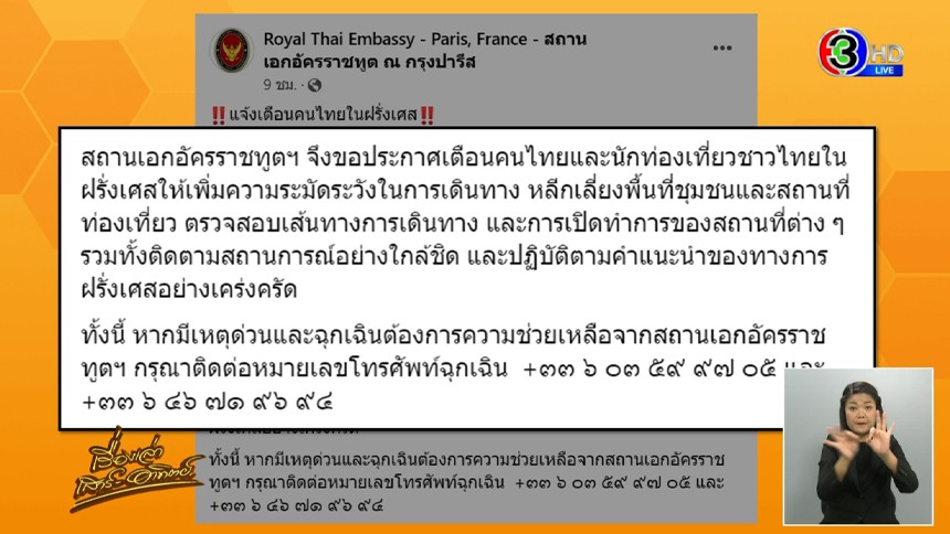 ทั้งนี้ หากมีเหตุด่วนและฉุกเฉินต้องการความช่วยเหลือจากสถานเอกอัครราชทูตฯ กรุณาติดต่อหมายเลขโทรศัพท์ฉุกเฉิน +๓๓ ๖ ๐๓ ๕๙ ๙๗ ๐๕ และ +๓๓ ๖ ๔๖ ๗๑ ๙๖ ๙๔"