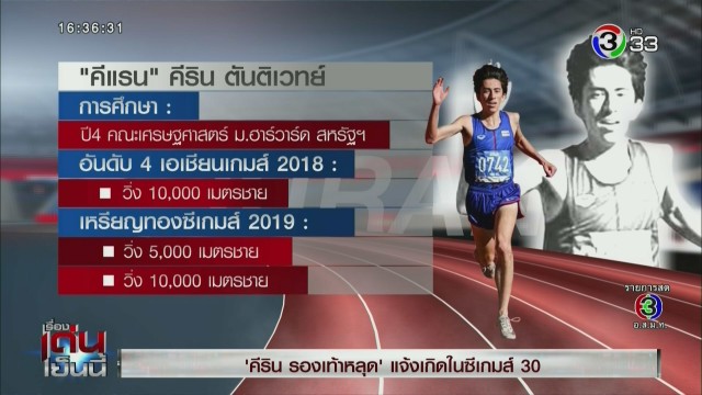 คีริน ตันติเวทย์ หนุ่มลูกครึ่งไทย-อเมริกัน วัย 22 ปี เจ้าของเหรียญทองวิ่ง 10000 เมตร คว้าเหรียญทองที่ 2 ของตัวเอง หลังวิ่งเข้าเส้นชัยเป็นคนแรกด้วยเวลา 14 นาที 31.15 วินาที ในการแข่งขันซีเกมส์ ครั้งที่ 30