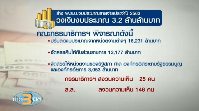 ร่างพระราชบัญญัติงบประมาณร่ายจ่ายประจำปีงบประมาณ 2563 ที่ผ่านการแปรญัตติในคณะกรรมาธิการวิสามัญ จากงบประมาณทั้งหมด 3.2 ล้านล้านบาท ได้ปรับลดลง 16,231 ล้านบาท ได้จัดสรรคืนให้กับส่วนราชการต่างๆ ตามที่คณะรัฐมนตรีเสนอตามความจำเป็น 13,177 ล้านบาท และจัดสรรให้หน่วยงานของรัฐสภา ศาล องค์กรอิสระตามรัฐธรรมนูญ และองค์กรอัยการ 3,053 ล้านบาท