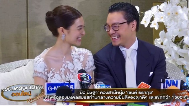 มากันงานฉลองสมรสพระราชทานของนางเอกสาว มิว นิษฐา กับสามีหนุ่ม เซนต์ ธราภุช ที่ได้ฤกษ์ดีเมื่อวานนี้ จัดงานฉลองที่โรงแรมดิ แอทธินี โฮเทลแบงค็อก ท่ามการบรรยากาศที่เรียบหรู โดยมีผู้หลักผู้ใหญ่ และเพื่อนๆ มาร่วมแสดงความยินดีกว่า 1,500 คน ซึ่งบรรยากาศก็เป็นไปอย่างชื่นมื่น และในงานแต่งงานเค้าบอกว่าใครได้รับช้อดอกไม้ในงานก็จะได้เป็นเจ้าสาวคนต่อไป โดยในงานนี้ คิมเบอร์ลี่ ได้รับช่อดอกไม้ไป หมาก ถึงกับกุมขมับ ซึ่งบรรยากาศในงานก็เป็นไปด้วยความอบอุ่น และในช่วงอาฟเตอร์ปาร์ตี้ ก็มีเซอร์ไพร์สโชว์จากคู่บ่าว – สาว และ เพื่อนๆ ก็น่ารักมากๆ