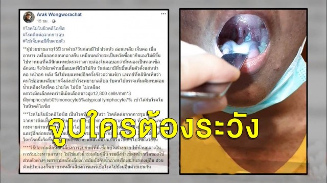 นพ.อารักษ์ วงศ์วรชาติ ผู้อำนวยการโรงพยาบาลสิชล จ.นครศรีธรรมราช โพสต์เฟซบุ๊ก Arak Wongworachat เตือนเรื่องโรคติดต่อจากการจูบ หรือโรคโมโนนิวคลิโอซิส หลังพบผู้ป่วยชายวัย 15 ปี ป่วยด้วยโรคนี้ โดยระบุว่า