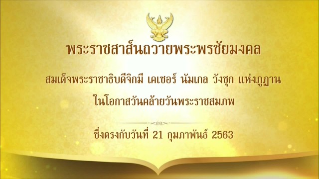 วันนี้ พระบาทสมเด็จพระเจ้าอยู่หัว ทรงพระกรุณาโปรดเกล้าโปรดกระหม่อม ให้ส่งข้อความพระราชสาส์นถวายพระพรชัยมงคล ไปยังสมเด็จพระราชาธิบดีแห่งภูฏาน ในโอกาสวันคล้ายวันพระราชสมภพ ของสมเด็จพระราชาธิบดีแห่งภูฏาน ซึ่งตรงกับวันที่ 21 กุมภาพันธ์ 2563 ความว่า...
