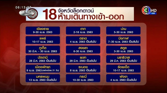 สำหรับ 18 จังหวัดที่มีการประกาศล็อคดาวน์ (ข้อมูลล่าสุดเมื่อวันที่ 9 เม.ย.63) ดังนี้