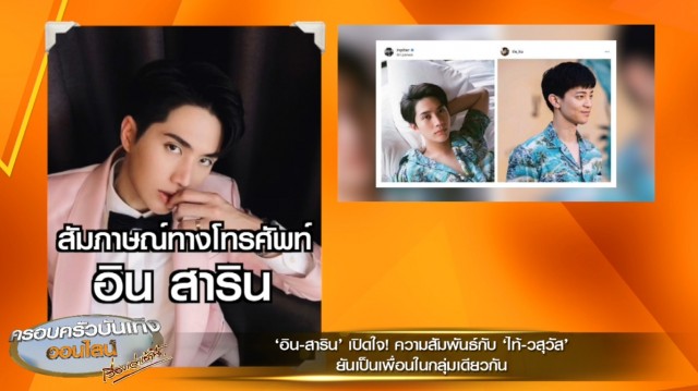 ซึ่งเมื่อสัปดาห์ที่ผ่านมา ก็จะมีข่าวของเจ้าตัวออกมา และพูดถึงในโลกโซเซียลเป็นอย่างมาก หลังจากมีเว็บไซต์หนึ่งนำเสนอข่าวอักษรย่อ ว่า พระเอกคบหาดูใจกับไฮโซหนุ่มน้องชายสามีนางเอกดัง จนในโลกออนไลน์ได้เดากัน และโยงไปถึง ‘อิน สาริน’ กับ ‘ไท้ วสุวัส’ น้องชายของ ‘เซนต์’ สามีของ ‘มิว นิษฐา’ พร้อมกับนำภาพของทั้งคู่ที่ใส่เสื้อเหมือนกัน และลงภาพไปในที่เดียวกัน จนเป็นกระแสในโลกออนไลน์