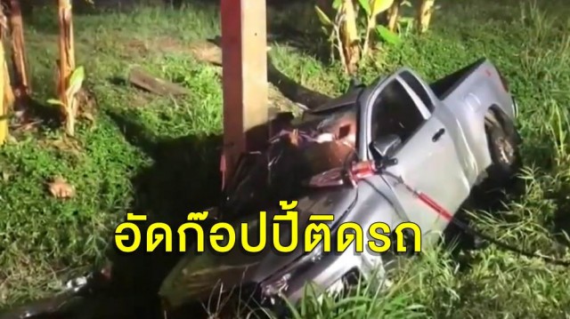 กระบะเสียหลักลงข้างทาง กระเด็นฟาดเสาไฟ คนขับดับคาที่คืนฝนตก
