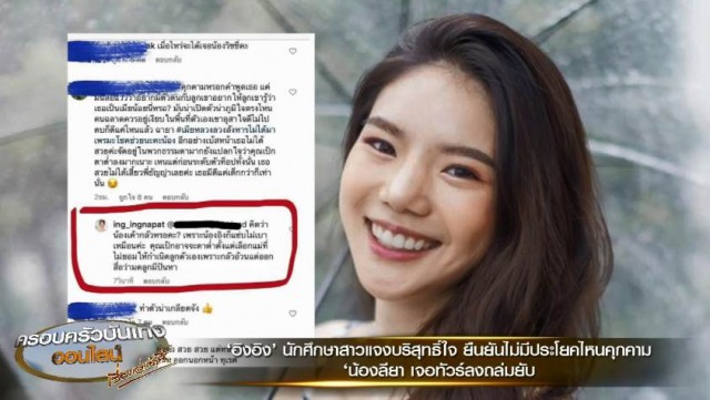 และสุดท้ายก็พบว่านักศึกษาคนที่ถูกพูดถึง ชื่อ ‘อิงอิง อิงณภัสร์’ ซึ่งก็มีชาวเน็ตได้เข้าไปคอมเม้นต์สอบถามในอินสตาแกรมของเธอ ว่าเรื่องที่เกิดขึ้นเป็นเรื่องจริงรึเปล่า โดย ‘อิงอิง’ ก็ได้ตอบคนที่เข้ามาถามบอกว่า “รอก่อนดีกว่าค่ะ หนูเป็นคนธรรมดา ไม่จำเป็นต้องมานั่งแถลงข่าว เชื่อว่าเราเป็นห่วง และมีใจที่บริสุทธิ์พอ ก่อนหน้านี้ก็มีการคุยกันตลอด ไม่มีประโยคไหนที่คุกคามน้องเลยค่ะ”