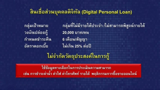 นายวิรไท สันติประภพ ผู้ว่าการธนาคารแห่งประเทศไทย เปิดเผยว่า สินเชื่อส่วนบุคคลดิจิทัล (Digital Personal Loan) เป็นสินเชื่อส่วนบุคคลภายใต้การกำกับที่ผู้ประกอบธุรกิจต้องใช้ข้อมูลทางเลือก เช่น การชำระค่าน้ำ ค่าไฟ ค่าโทรศัพท์ รายได้ หรือพฤติกรรมการซื้อขายออนไลน์ ในการประเมินความสามารถ หรือ ความเต็มใจในการชำระหนี้