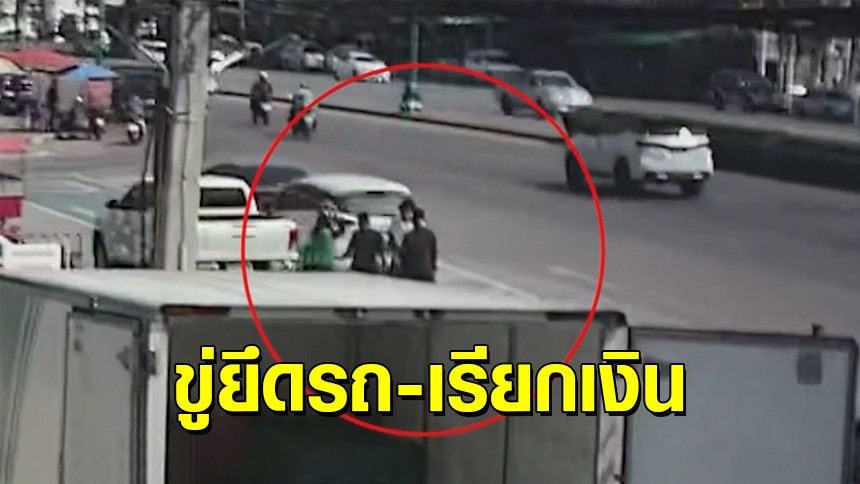 คลิปชัด พ่อค้าขายน้ำส้ม ถูกกลุ่มชายฉกรรจ์ปิดล้อม ขู่ยึดรถกลางถนน เรียกเงิน 2 แสน