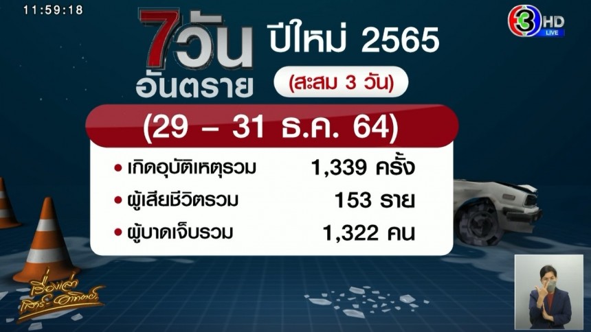 สรุปอุบัติเหตุทางถนนสะสมในช่วง 3 วันของการรณรงค์ (29 – 31 ธ.ค. 64) เกิดอุบัติเหตุรวม 1,339 ครั้ง ผู้เสียชีวิตรวม 153 ราย ผู้บาดเจ็บรวม 1,322 คน