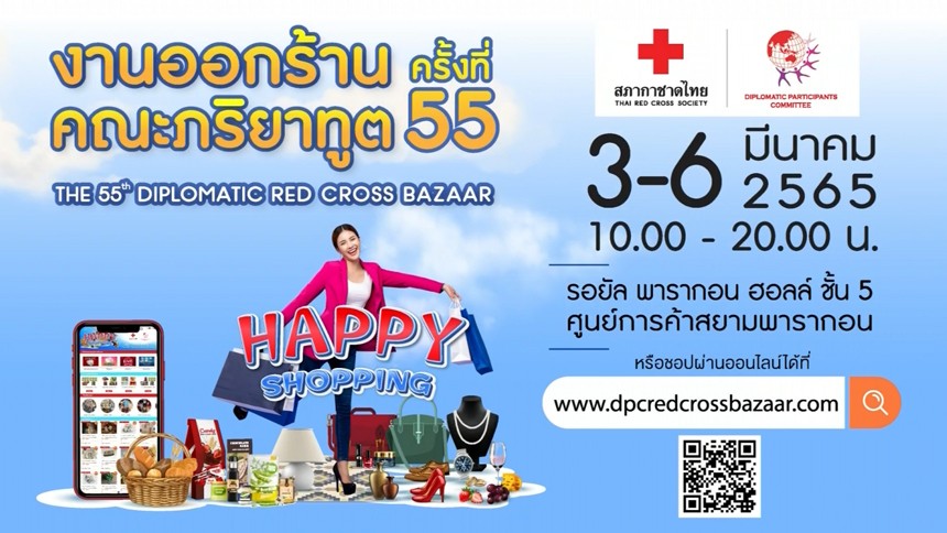 โดยงานออกร้านคณะภริยาทูต จัดขึ้นเป็นครั้งที่ 55 ภายใต้แนวคิด "Happy Shopping - ชอปสนุกสุขทุกการให้" ณ รอยัล พารากอน ฮอลล์ ชั้น 5 สยามพารากอน และเลือกซื้อผ่านออนไลน์ได้ที่ www.DPCRedcrossbazaar.com ซึ่งจะมีไปจนถึงวันที่ 6 มีนาคม 2565