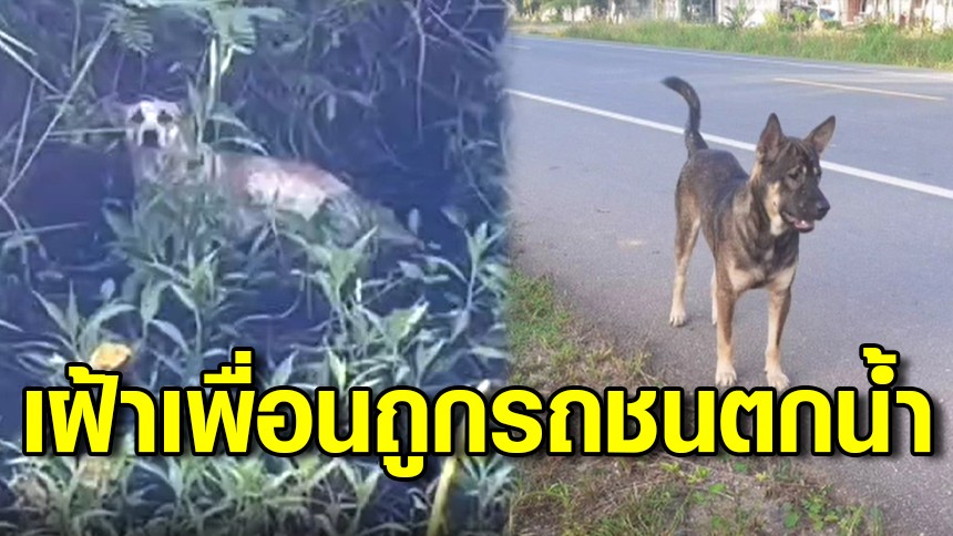 เพื่อนไม่ทิ้งกัน! สุนัขถูกรถชนกระเด็นตกน้ำ ขาหัก เพื่อนอีกตัวเฝ้าไม่ห่าง