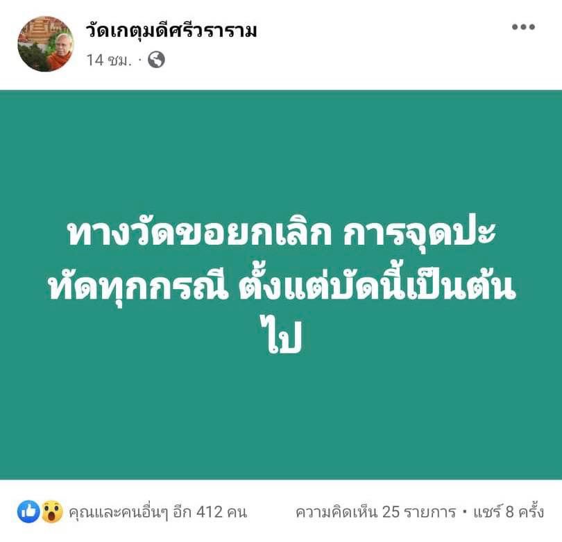 อย่างไรก็ตาม หลังกลายเป็นกระเด็นดรามา เฟซบุ๊กวัดเกตุมดีศรีวราราม ประกาศยกเลิกการจุดปะทัดทุกกรณี อีกทั้งยังขู่ดำเนินคดีตามกฎหมายกับชาวเน็ต ที่แสดงความคิดเห็นในการก่อให้เกิดความเสียหายแก่ทางวัดอีกด้วย