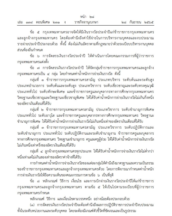 ราชกิจจานุเบกษา เผยแพร่ข้อบัญญัติ กทม. จ่ายโบนัสข้าราชการและลูกจ้าง สังกัด กทม. สูงสุด 2 เท่าของเงินเดือน