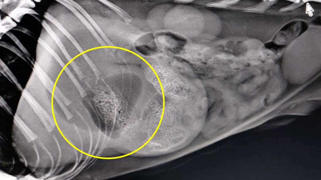 หมอจับ X-ray พบสิ่งแปลกปลอมอุดตันในกระเพาะอาหาร จนกระเพาะอาหารขยายขนาด แมวมีภาวะท้องกาง และผอมมาเลยค่ะ (1.8 kg)