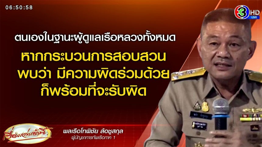 ผู้บัญชาการทัพเรือภาค 1 บอกด้วยว่า ตัวเอง ในฐานะผู้ดูแลเรือหลวงทั้งหมด หากกระบวนการสอบสวน พบว่า มีความผิดร่วมด้วย ก็พร้อมที่จะรับผิด ขณะเดียวกันยังบอกด้วยว่า กรณีที่เกิดขึ้นความจริงถือเป็นสิ่งสำคัญ ซึ่งที่ผ่านมาส่วนตัวพูดความจริง ชี้แจงด้วยข้อเท็จจริงมาโดยตลอด