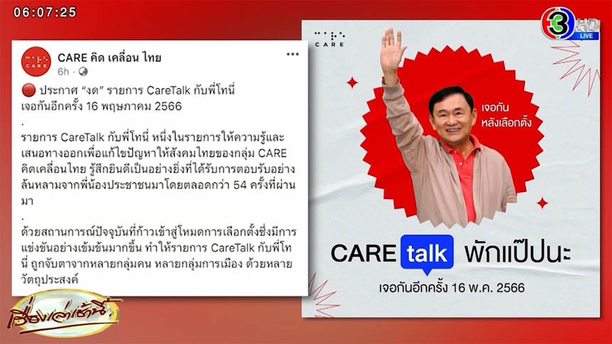 'กลุ่มแคร์' ประกาศงดรายการ 'CareTalk กับพี่โทนี่' จะกลับมาจัดเต็มหลังเลือกตั้ง