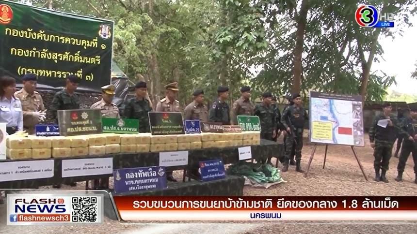 ทหารกองกำลังสุรศักดิ์มนตรี แถลงจับกุมขบวนการ ลักลอบขนยาบ้าข้ามชาติ ได้ผู้ต้องหา 2 คน ยึดยาบ้าได้ 1 ล้าน 8 แสนเม็ด เบื้องต้นพบว่าเป็นยาบ้าสูตรใหม่ ตราสัญญลักษณ์ใหม่ ที่ยังไม่เคยจับกุมได้มาก่อน ลักลอบลำเลียงข้ามแม่น้ำโขง จากประเทศเพื่อนบ้านมาขึ้นฝั่งไทย ที่จังหวัดนครพนม