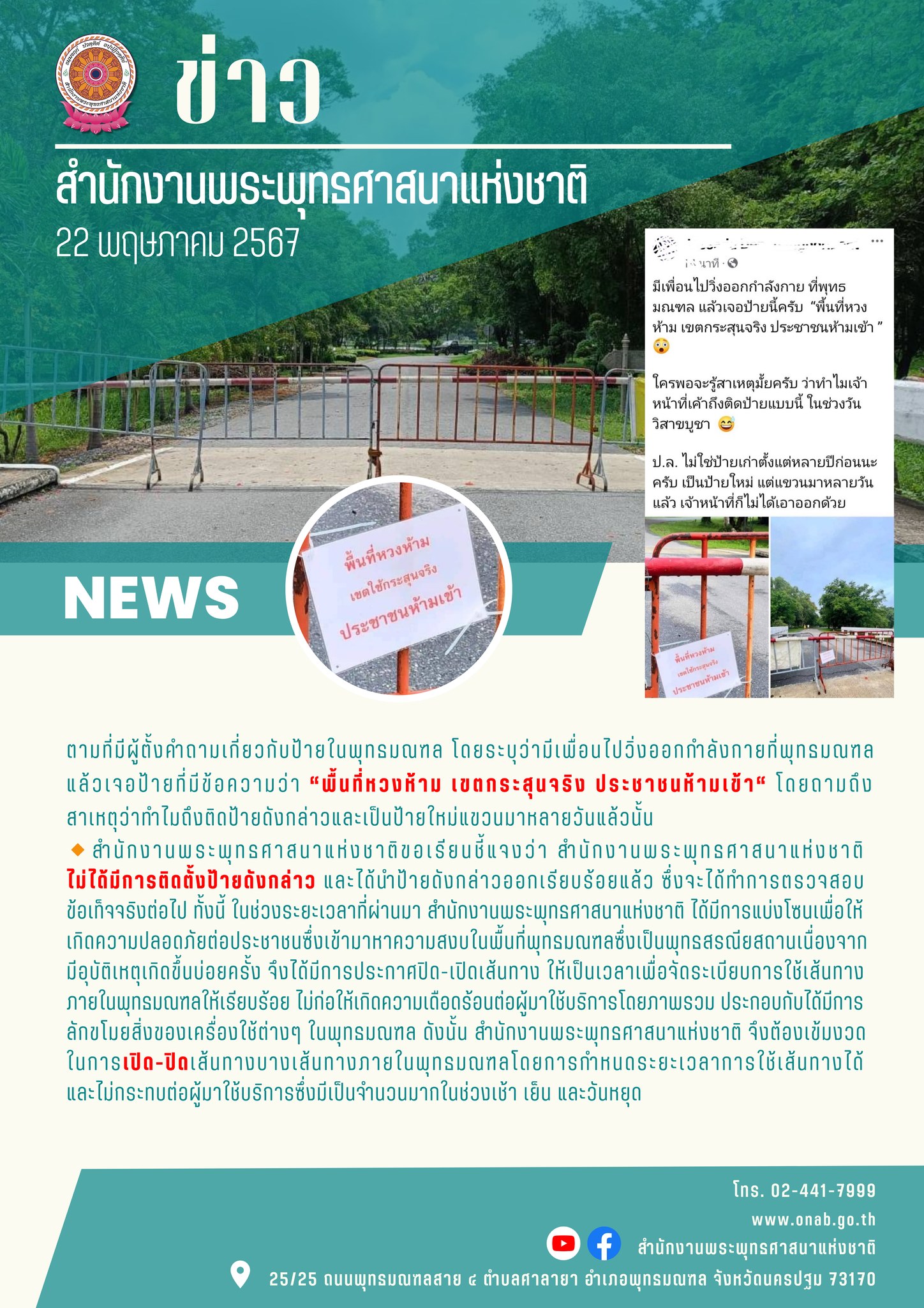 สำนักพุทธแจง ไม่ได้ติดป้าย “พื้นที่หวงห้าม เขตกระสุนจริง” ที่พุทธมณฑล เอาป้ายออกแล้ว ชี้แบ่งโซนพุทธมณฑลความปลอดภัยเป็นระเบียบเรียบร้อย