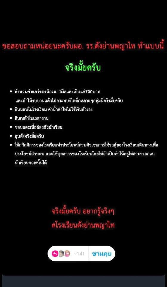 นอกจากนี้ยังมีการเปิดเผยจากแหล่งข่าวอีกว่า "ทั้งโรงเรียนเซฟเด็ก แต่ไม่เซฟ ผอ.รร.ทางโรงเรียนหวังว่าเพจซ้อจะเป็นกระบอกเสียงให้มีหน่วยงานภาครัฐเข้าสืบสาวความจริงและหวังว่าจะมีสื่อสนใจหยิบเรื่องนี้ไปขยายต่อ"