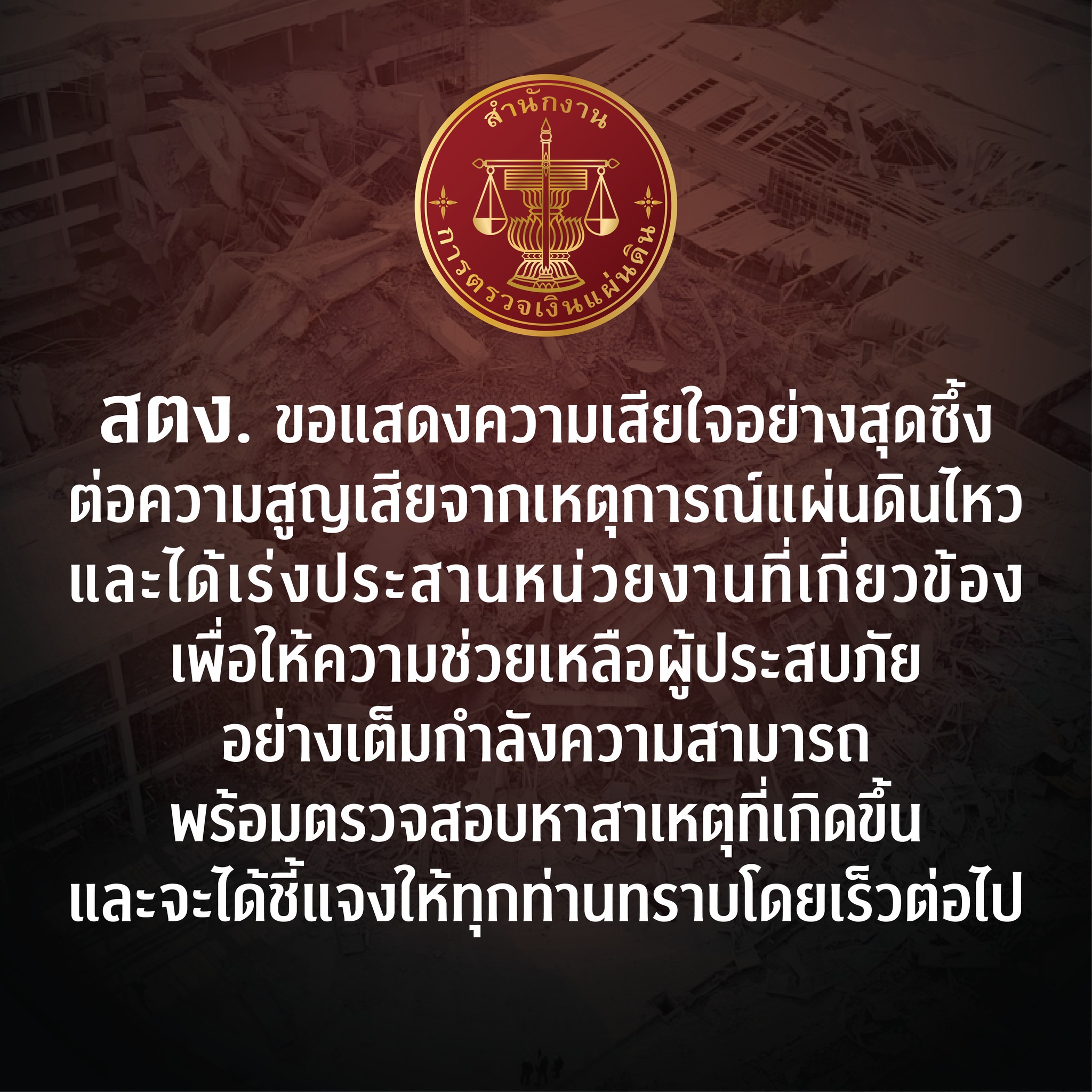 ล่าสุด (29 มี.ค.) สำนักงานการตรวจเงินแผ่นดิน โพสต์บนเพจเฟซบุ๊กแสดงความเสียใจถึงเหตุการณ์ที่เกิดขึ้น ระบุว่า “สำนักงานการตรวจเงินแผ่นดิน สตง. ขอแสดงความเสียใจอย่างสุดซึ้งต่อความสูญเสียจากเหตุการณ์แผ่นดินไหว และได้เร่งประสานหน่วยงานที่เกี่ยวข้อง เพื่อให้ความช่วยเหลือผู้ประสบภัยอย่างเต็มกำลังความสามารถ พร้อมตรวจสอบหาสาเหตุที่เกิดขึ้น และจะได้ชี้แจงให้ทุกท่านทราบโดยเร็วต่อไป”