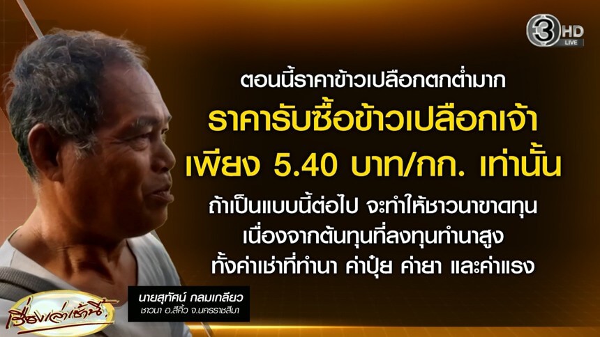 วานนี้ (12 พฤศจิกายน 2568) ช่วงนี้หลายพื้นที่ในจังหวัดนครราชสีมา กำลังเข้าสู่ช่วงฤดูเก็บเกี่ยวข้าวนาปีที่ปลูกเอาไว้ อย่างเช่น นาข้าวของ นายสุทัศน์ กลมเกลียว อายุ 57 ปี ชาวนาอำเภอสีคิ้ว จ.นครราชสีมา ซึ่งปลูกข้าวหอมมะลิ ทั้งหมดจำนวน 40 ไร่ ใช้เงินลงทุนไปกว่า 60,000 บาท ขณะนี้ต้นข้าวกำลังออกรวง และใกล้เก็บเกี่ยวในอีกไม่กี่สัปดาห์ แต่สิ่งที่เป็นกังวลก็คือ ราคาข้าวเปลือกในตลาดปัจจุบันนี้ ราคาตกต่ำเหลือเพียงกิโลกรัมละ 5.40 บาท ถ้าเก็บเกี่ยวข้าวไปขายก็ไม่คุ้มทุน จึงได้แต่หวังว่าในช่วงฤดูเก็บเกี่ยวทางรัฐบาลจะมีการประกันราคาข้าวเปลือกเพิ่มขึ้น