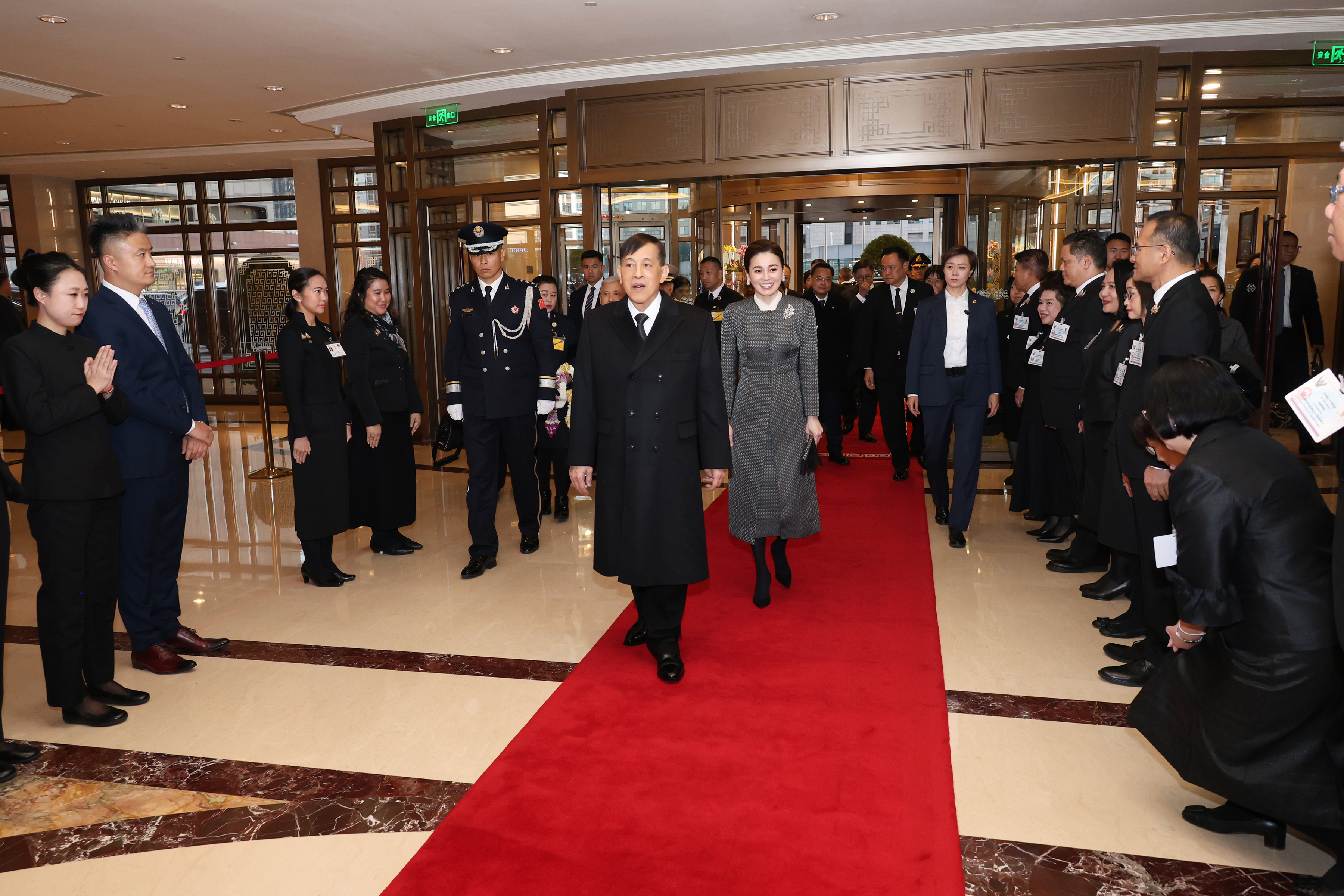 นางพนิดา เขียวอุไร ภริยาเอกอัครราชทูต ณ กรุงปักกิ่ง และนางสาวนลินทิพย์ หอมวิเศษวงศา อัครราชทูต (ฝ่ายพาณิชย์) ทูลเกล้าทูลกระหม่อมถวายมาลัยข้อพระกร ผู้ช่วยทูตฝ่ายทหารทั้ง 3 เหล่าทัพ เฝ้าทูลละอองธุลีพระบาทรับเสด็จ