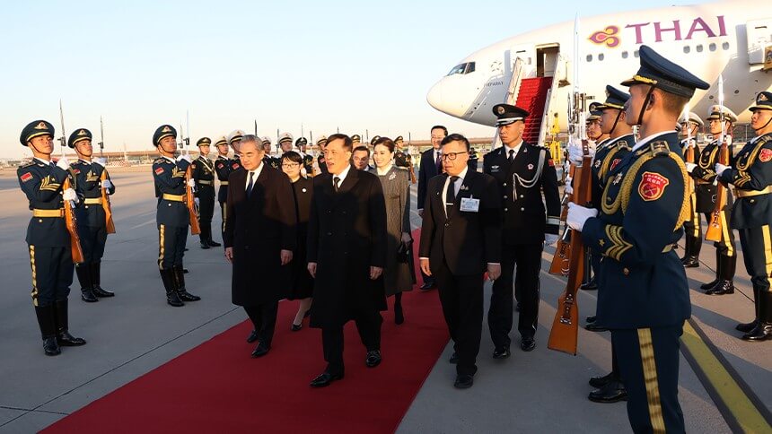เวลา 16 นาฬิกา 3 นาที วันนี้ ตามเวลาท้องถิ่นของสาธารณรัฐประชาชนจีน ซึ่งเร็วกว่าประเทศไทย 1 ชั่วโมง พระบาทสมเด็จพระเจ้าอยู่หัว และสมเด็จพระนางเจ้า ฯ พระบรมราชินี ประทับเครื่องบินพระที่นั่งของบริษัท การบินไทย จำกัด (มหาชน) เที่ยวบินที่ ทีจี 8886 เสด็จพระราชดำเนินถึงยังท่าอากาศยานนานาชาติกรุงปักกิ่ง สาธารณรัฐประชาชนจีน ตามคำทูลเชิญของนายสี จิ้นผิง ประธานาธิบดีแห่งสาธารณรัฐประชาชนจีน ในโอกาสฉลองครบ 50 ปี การสถาปนาความสัมพันธ์ทางการทูตไทย-จีน ระหว่างวันที่ 13-17 พฤศจิกายน 2568