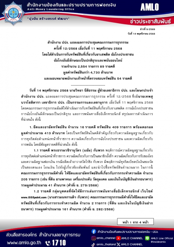 วันที่ 14 พฤศจิกายน 2568 นายวิทยา นีติธรรม ผู้ช่วยเลขาธิการ ปปง. และโฆษกประจำสำนักงาน ปปง. แถลงผลการประชุมคณะกรรมการธุรกรรม ครั้งที่ 12/2568 ซึ่งมีนายเทพสุ บวรโชติดารา เลขาธิการ ปปง. เป็นกรรมการและเลขานุการ เมื่อวันที่ 11 พฤศจิกายน 2568 โดยคณะกรรมการธุรกรรมมีมติให้ดำเนินการกับทรัพย์สิน พระธรรมวชิรานุวัตร (แย้ม) กับพวก