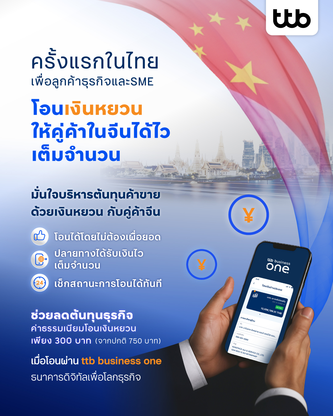 1.บริการโอนเงินไปต่างประเทศ ทีทีบี ครั้งแรกในไทยที่ธุรกิจโอนเงินหยวนให้คู่ค้าในจีนได้ไว เต็มจำนวนครบทุกหยวน ไม่มีหักปลายทาง ไม่ต้องเผื่อยอดโอน เมื่อโอนเงินสกุลหยวนไปจีนผ่านช่องทาง ttb business one ค่าธรรมเนียมการโอนเพียง 350 (จากปกติ 750 บาท)