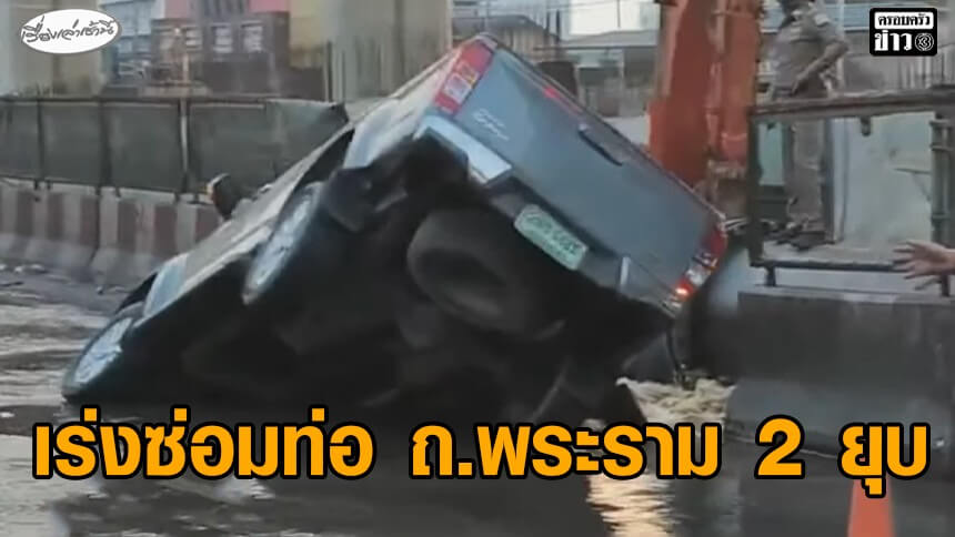 ประปาเร่งซ่อมท่อที่แตก หลังถนนพระราม 2 ทรุดตัวทำกระบะเสียหลักหัวทิ่มตกลงไป