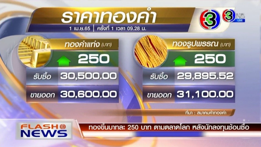 สมาคมค้าทองคำ ประกาศราคาซื้อขายทองคำในประเทศครั้งที่ 1 วันนี้ ปรับขึ้นบาทละ 250 บาท ทองคำแห่ง ขายออกบาทละ 30,600 บาท ทองรูปพรรณ ขายออก 31,100 บาท ก่อนปรับลดลงบาทละ 50 บาท เมื่อเวลา 09.50 น. ปรับขึ้นตามตลาโลก เหตุนักลงทุนเข้าซื้อทองคำ ป้องกันความเสี่ยงจากเงินเฟ้อสหรัฐฯ หลังดัชนีราคาการใช้จ่ายเพื่อการบริโภคส่วนบุคคล สูงสุดในรอบเกือบ 40 ปี