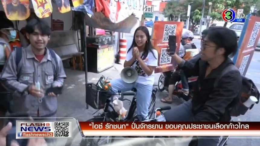 ไอซ์ รักชนก ศรีนอก ว่าที่ ส.ส.กทม.เขตบางบอน พรรคก้าวไกล ปั่นจักรยานคู่ใจที่ใช้ในการหาเสียงเลือกตั้ง ขอบคุณประชาชนในพื้นที่ หลังเอาชนะ วัน อยู่ปารุง ของพรรคเพื่อไทย มีประชาชนร่วมแสดงความยินดีจำนวนมาก ไอซ์ รักชนก ติดป้ายขอบคุณและคิวอาร์โค้ดไว้ที่จักรยาน เพื่อให้ประชาชนแจ้งปัญหา
