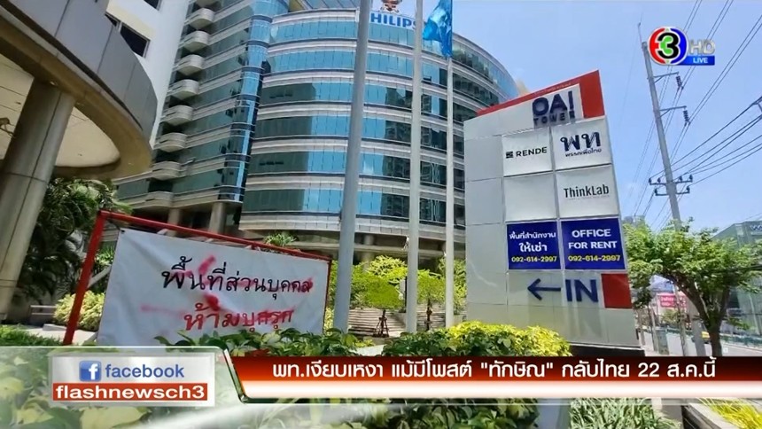 บรรยากาศที่พรรคเพื่อไทย ยังเงียบเหงา แม้นางสาวแพทองธาร ชินวัตร หัวหน้าครอบครัวเพื่อไทย โพสต์อินสตราแกรมว่าจะไปรับ นายทักษิณ ชินวัตร ในวันที่ 22 สิงหาคม ที่ท่าอากาศยานดอนเมือง ขณะที่สื่อมวลชน ยังติดตามความเคลื่อนไหว และต่างจับตาว่า การกลับมาของอดีตนายกรัฐมนตรี จะมีนัยยะทางการเมืองหรือไม่ เนื่องจากตรงกับวันโหวตเลือกนายกรัฐมนตรี