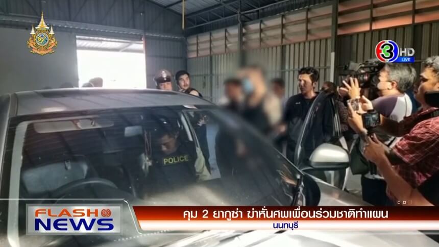 ตำรวจ สภ.บางบัวทอง นนทบุรี คุมตัว 2 ผู้ต้องหาชาวญี่ปุ่น สมาชิกแก๊งค์ยากูซ่า ฆ่าหั่นศพเพื่อนร่วมชาติ ทำแผนประกอบคำรับสารภาพ เผยปมฆ่าเกิดจากเงิน 8 ล้าน ที่ว่าจ้างผู้เสียชีวิตทำงานบางอย่าง แต่ทำไม่สำเร็จ โดยเจ้าหน้าที่ตามจับกุมตัวได้หลังหลบหนีไปจังหวัดหนองคาย