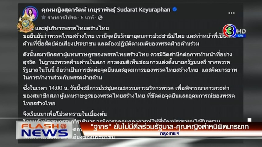 นายฐากร ตัณฑสิทธิ์ สส.บัญชีรายชื่อพรรคไทยสร้างไทย ยืนยัน 6 สส.ที่โหวตสวนมติพรรคร่วมฝ่ายค้าน ไม่มีดีลร่วมรัฐบาลและยังเป็นฝ่ายค้าน ขณะที่คุณหญิงสุดารัตน์ เกยุราพันธ์ หัวหน้าพรรค โพสต์ตำหนิลูกพรรค ผิดมารยาทต่อจุดยืนและอุดมการณ์ พร้อมเรียกประชุมกรรมการบริหารพรรคพิจารณากระทำ