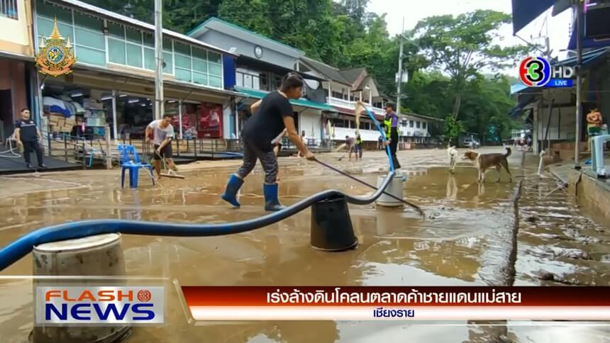 แม่สาย เชียงราย เจ้าหน้าที่และชาวบ้านช่วยกันกวาดล้างคราบดินโคลน ย่านการค้าชุมชนสายลมจอย หลังเจอน้ำท่วมฉับพลัน จากผนังกั้นนำที่พังทลาย ซึ่งเจ้าหน้าที่ต้องเร่งซ่อมแซมให้เสร็จภายในวันนี้ เนื่องจากมีรายงานจากกรมอุตุนิยมวิทยา แจ้งว่าจะยังคงมีฝนตกบริเวณพื้นที่ภาคเหนืออย่างต่อเนื่องอีกหลายวัน