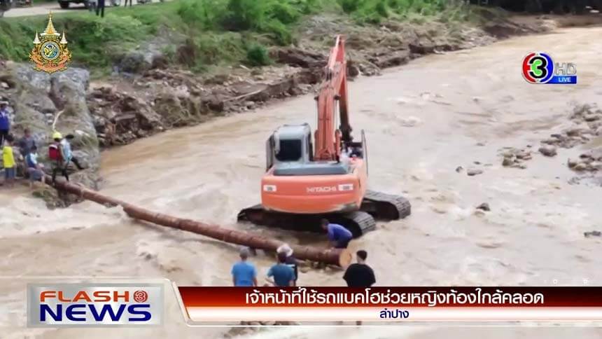เจ้าหน้าที่ใช้รถแบคโฮช่วยหญิงท้องใกล้คลอด